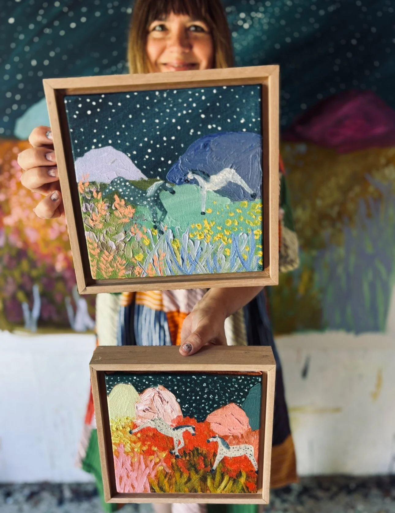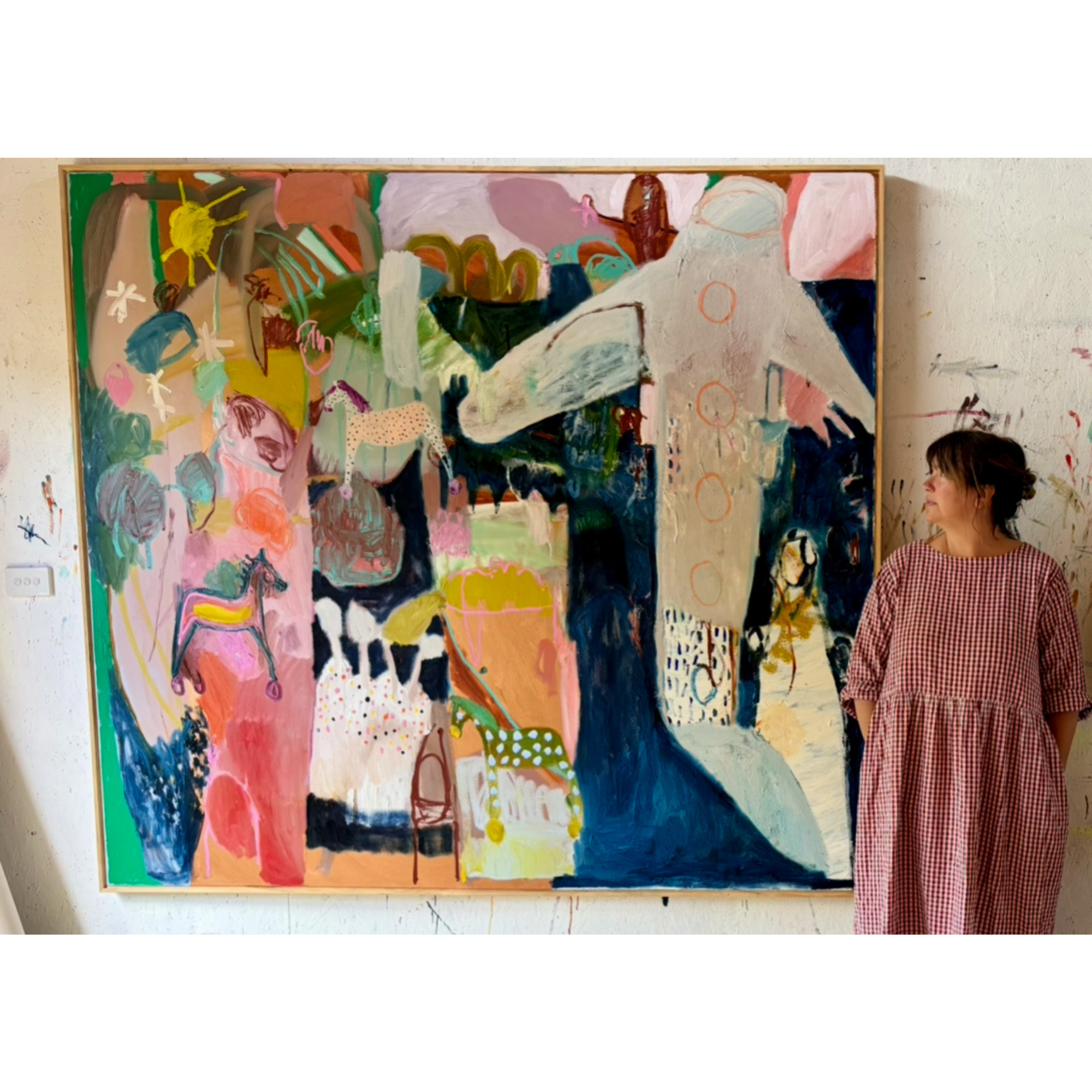 These abstracted, colourful landscapes are rendered in thick, buttery oil paint with the horse being a motif often explored within these magical realms. For her, the horses are a nostalgic look at childhood dreams and when Kate is painting them, they represent energetic beings i.e. People and other animals in her world.